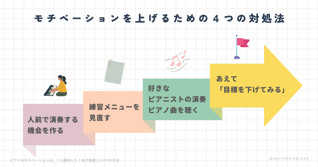 この記事では、大人の趣味ピアノでモチベーションが下がったとき、私が実際にやって効果を感じた方法をいくつかご紹介します。